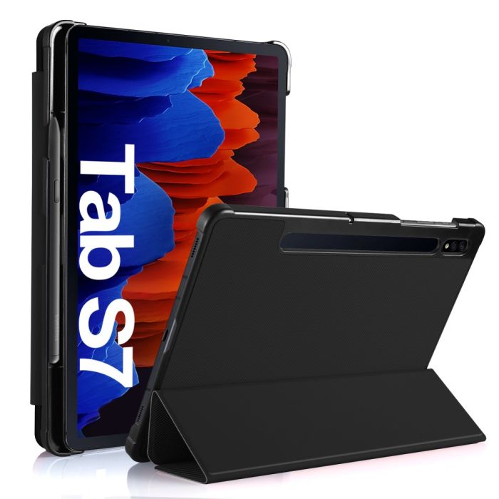 Lätt och tåligt fodral till Samsung Galaxy Tab S7. Fodralet har en slimad design och fodralet kan även användas som ställ för att underlätta te.x filmvisning.