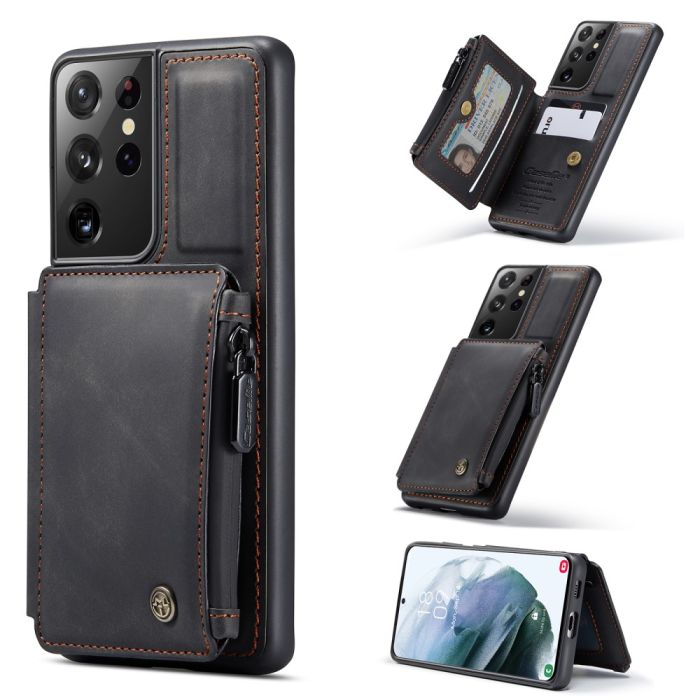 CASEME läderskal med plånboksfunktion och kortplatser för Samsung Galaxy S21 Ultra. Designad med kortplatser och ficka med dragkedja för att hålla kort och pengar.