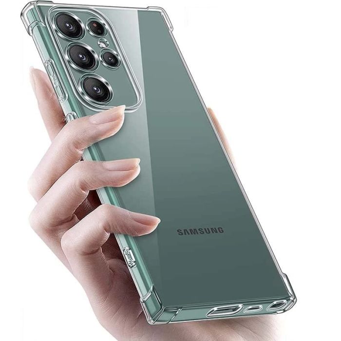 Transparent silikon skal till Samsung Galaxy S23 Ultra med extra stöt absorberande hörn samt extra skydd kring dina kameralinser så du slipper köpa till ett linsskydd.