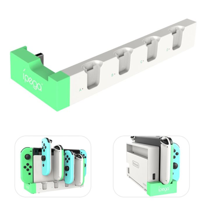 iPega Nintendo Switch Joy-Con laddningsdocka med 4 fack, i vit/grön färg, gör det möjligt att ladda upp till 4 Joy-Con kontroller samtidigt. Laddningsfacken är märkta med bokstäverna A, B, C och D.