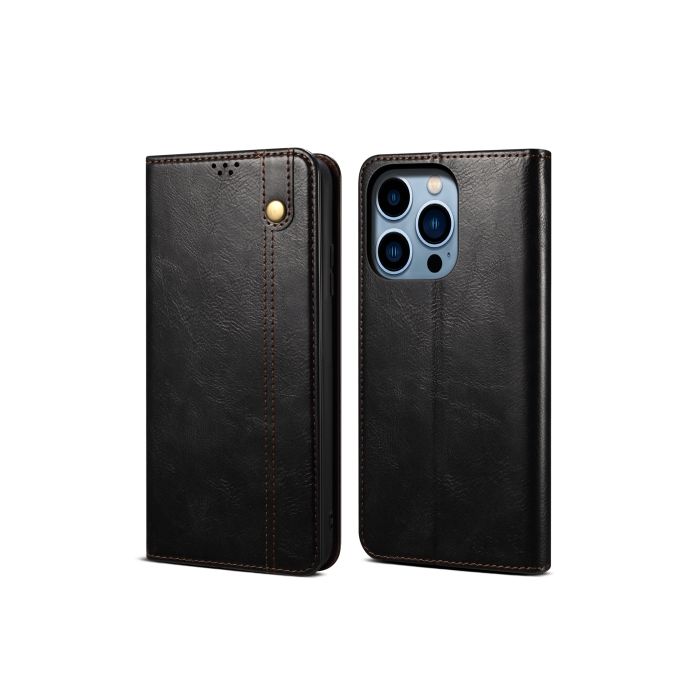 iPhone 14 Pro Fodral Flip Wax Läder Svart