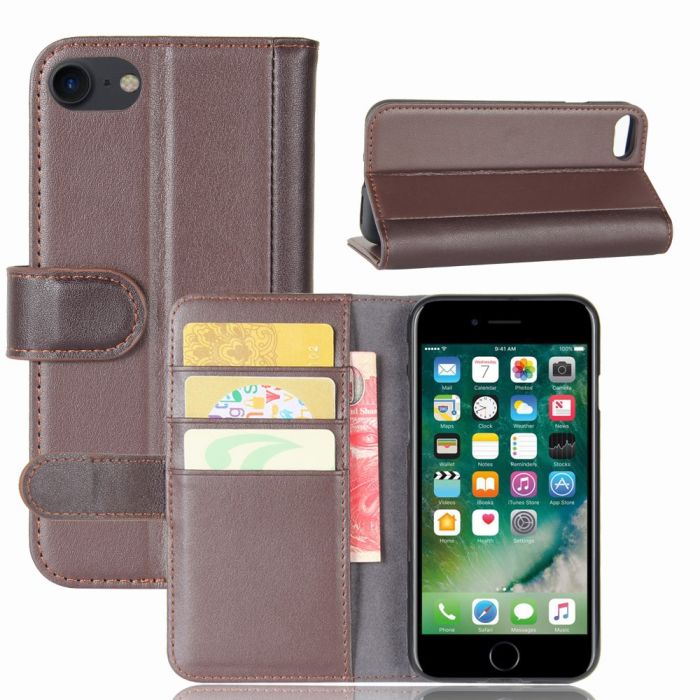 Högkvalitativt split läder fodral till iPhone 7/8/SE (2020) ger din smartphone ett stilrent utseende samtidigt som du får med dina viktigaste medel. Fodralet har en magnet stängning som håller din smartphone, ID-kort, kreditkort och sedlar på säker plats.