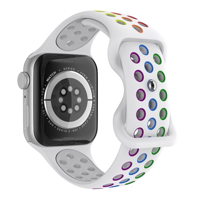 Apple Watch armband tillverkat av premium silikon som är mjukt, andningsbart och bekvämt för din handled. Hålen gör att armbandet håller handleden sval.